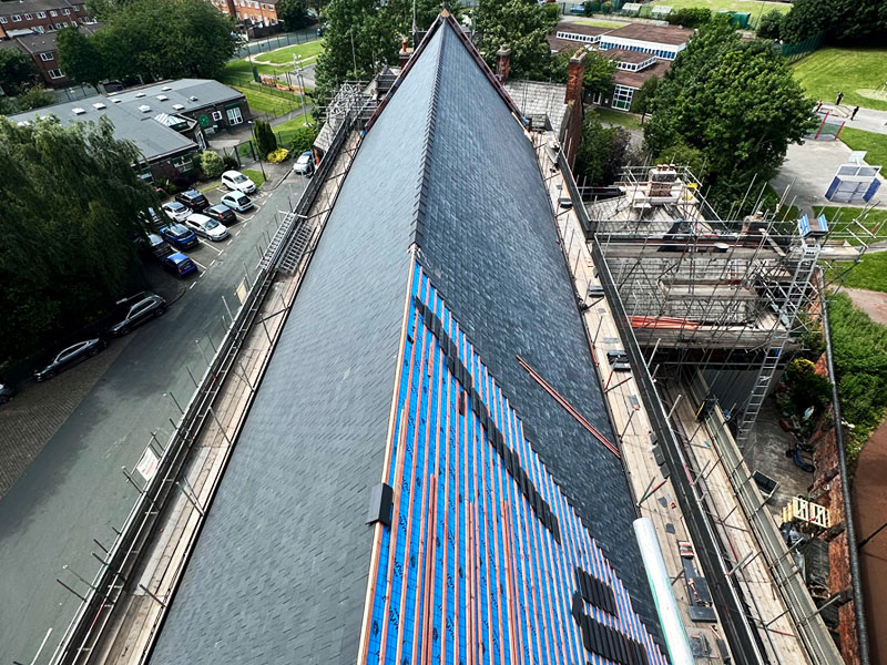 Permavent APEX membrane played a key role in renewing the pitched roof coverings, which were finished using a combination of reclaimed slate from the site and closely matched Canadian Glendyne Slate.