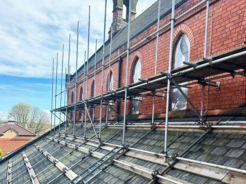 St. Patrick’s Catholic Church in Wigan, a striking red-brick building in the lancet Gothic style, was built in 1874 for St Patrick, to the designs of Liverpool architect James O’Byrne, who was also working on St Joseph’s College in nearby Upholland at the time. As a prominent local landmark with deep historical and architectural significance, the church has long served as a spiritual and community hub. However, recent years saw the building suffer from a serious roof leak, threatening both its structural integrity and interior features. In response, a major re-roofing project was undertaken, not only to address the immediate issue of water ingress but also to restore and preserve the church for future generations.